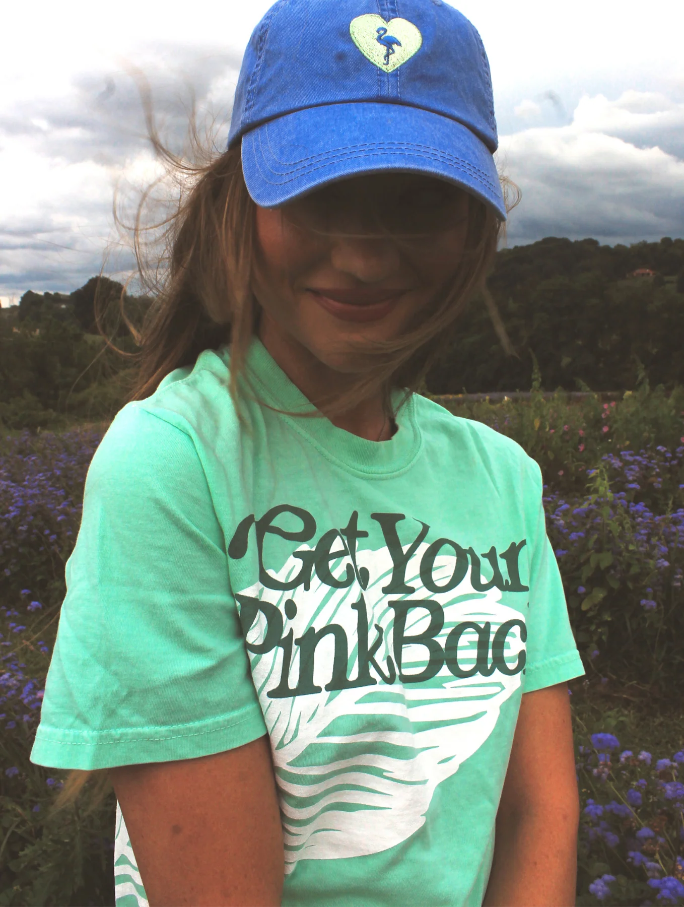 This turquoise tee has “Get Your Pink Back” printed on the front with a white flamingo feather in the background. It also has a GYPB reminder on the front and a little green feather on the left sleeve.
