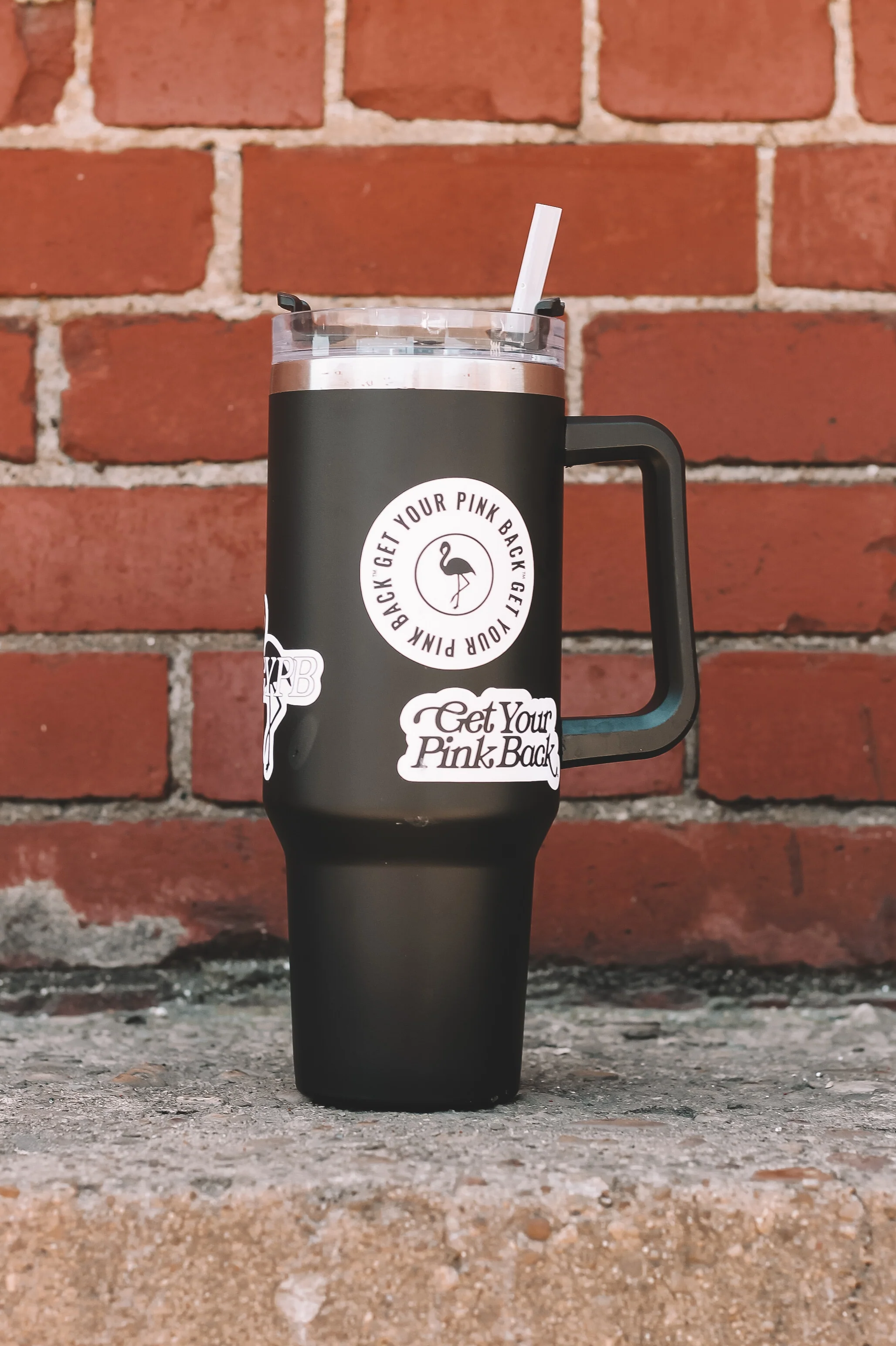 Ask and you shall receive! The Get Your Pink Back drink tumbler and sticker combo! Made from stainless steel, holding 40oz this tumbler is great for keeping drinks hot or cold all day long. Each tumbler comes with 5 GYPB stickers for you to transform your new drink buddy anyway you’d like! Add a jumbo tote, drink koozie or anything else from the Black and White Line!