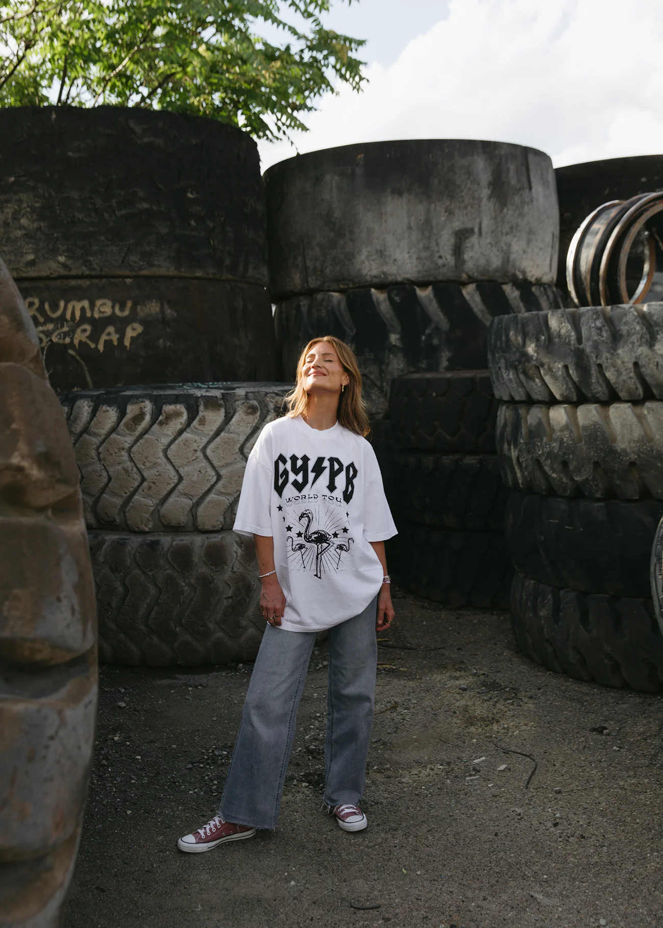 Originally part of the swag bag at our first Flock N Roll event, this tee soon became a fan favorite but was never for sale…UNTIL NOW!!! Part of the Flock N Roll Collection, this tee has black vintage rock n’ roll “GYPB” design on a white tee that’s perfectly slouchy.